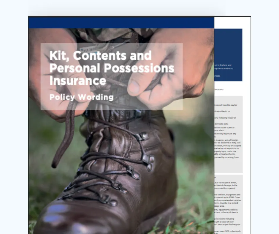 Military Kit Insurance is a specialist policy for serving members of the British Army, Royal Navy, Royal Marines and RAF. The cover protects military-issued equipment, personally purchased kit, contents and personal belongings against loss, theft and accidental damage.